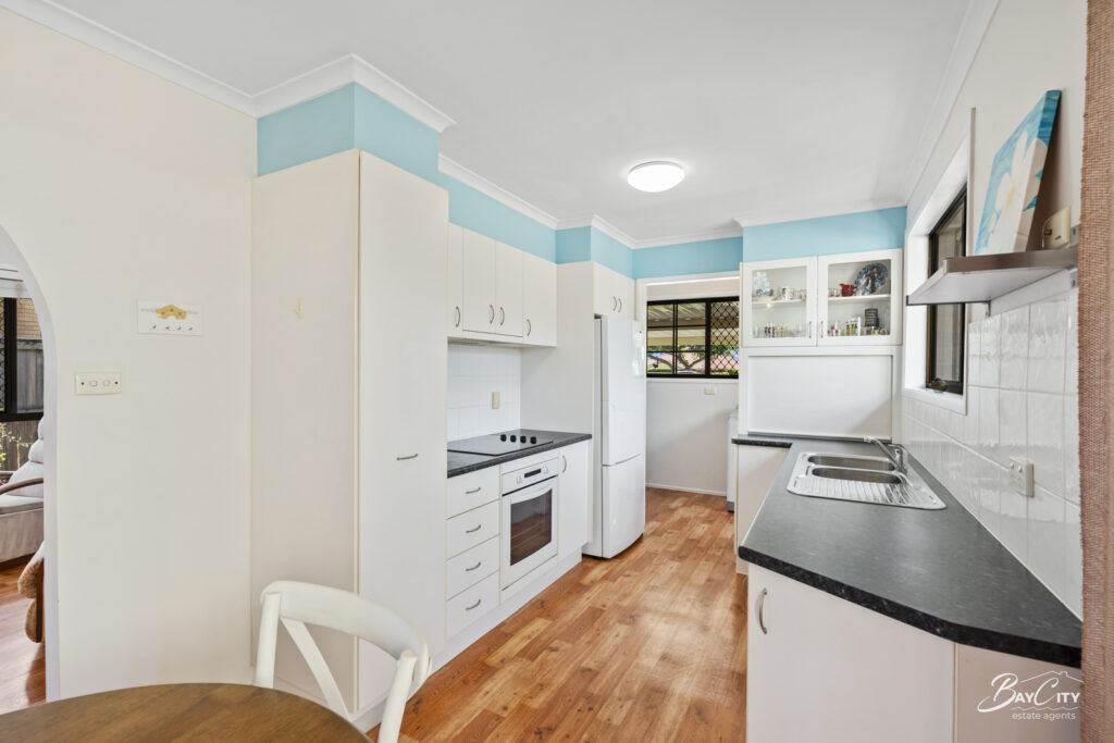 Step inside to a light-filled, open-plan layout where the living area sits at the heart of the home, enhanced by full-length windows and ceiling fans for year-round comfort. The modernised kitchen is both practical and functional, offering ample bench space and storage, with easy access to the separate laundry.